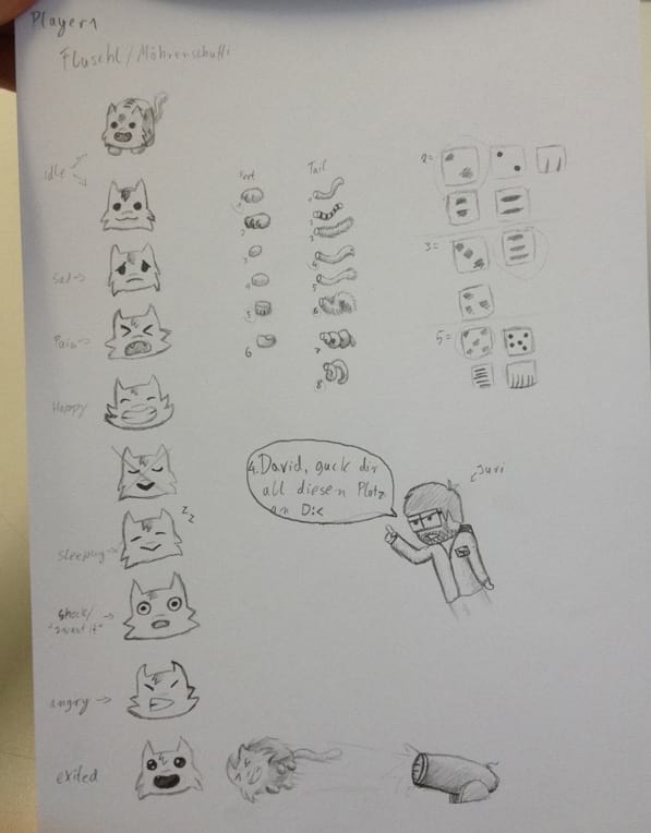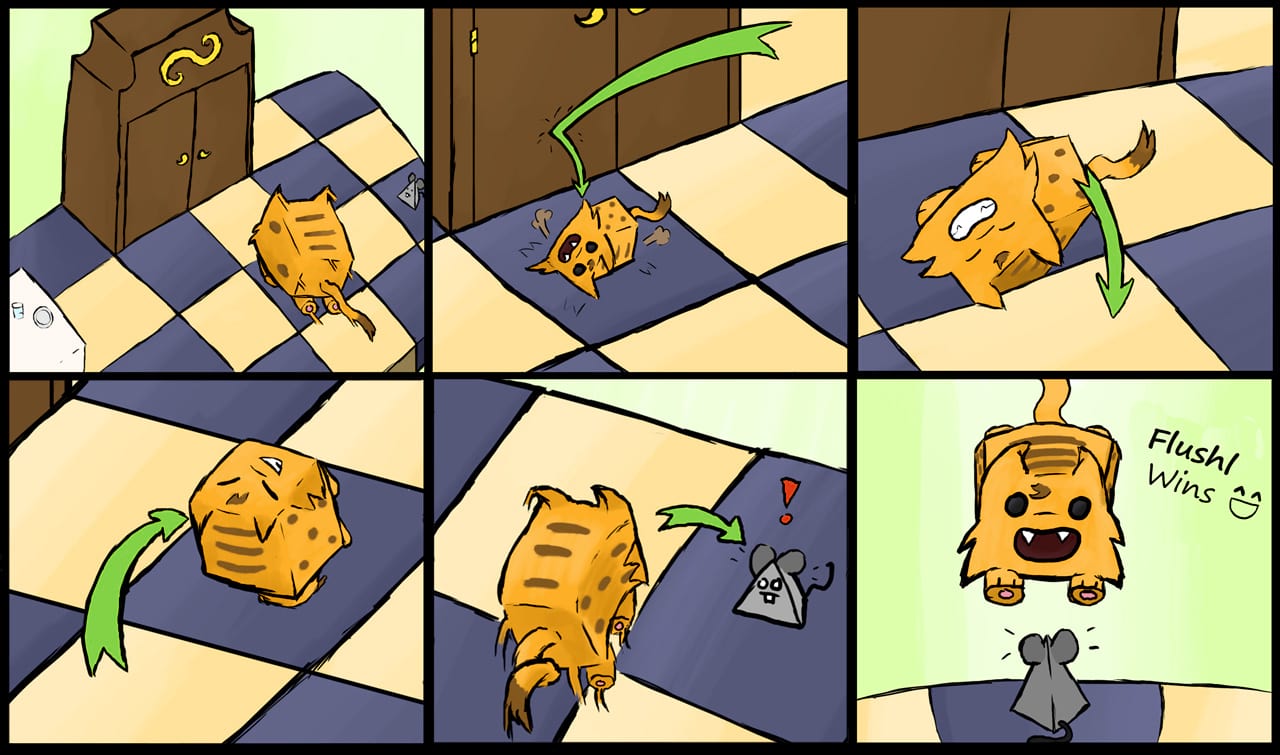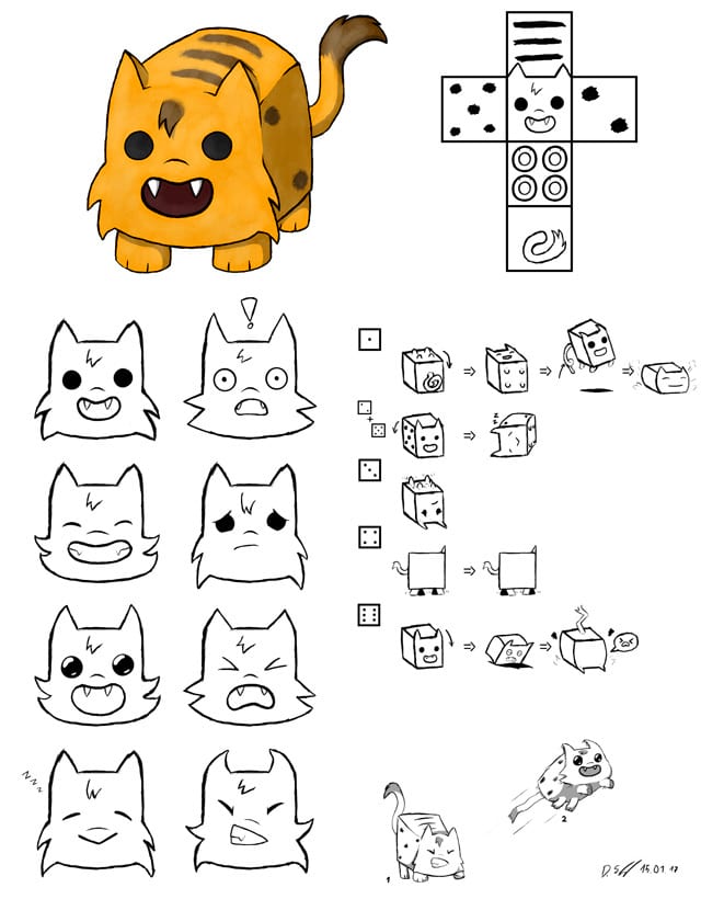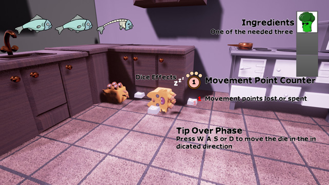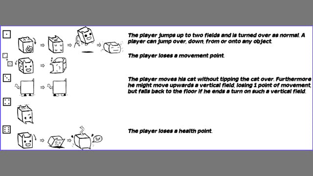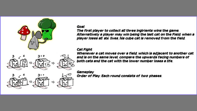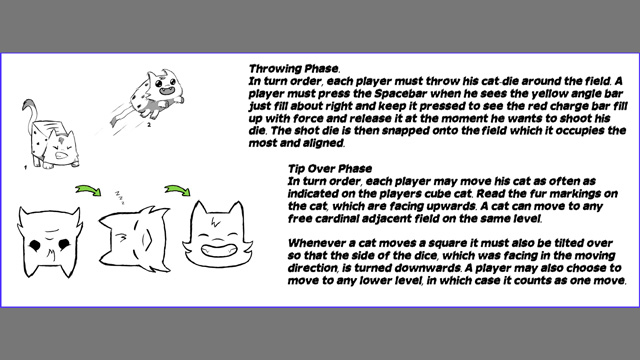 Cats, turned into cubes by a witch, participate in a board-game. They are thrown like dice, where the outcome of the roll determines how far the cube/cat can move. At each step the cube rolls over, triggering new effects, for example a cat can jumping, when turned on its tail. Skillfully rolling the dice and carefully planning moves is essential to winning the race against other felines. A few cats fight with claws over the scarce ingredients, which are needed to lift the spell.